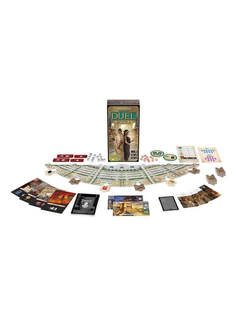 C’est dans les rangs du Sénat que sont prises les décisions qui façonnent la destinée d’une civilisation.. et dans les couloirs sombres que les comploteurs uvrent pour leur propre intérêt. Cette extension de 7 Wonders Duel met en scène des Sénateurs et leur influence sur les Chambres du Sénat. Tentez de contrôler ces Chambres pour bénéficier de Décrets, ou faites appel à des Comploteurs qui pourraient bien renverser la situation. Complots et Sénateurs pour renouveler vos parties de 7 Wonders Duel :7 Wonders Duel Agora est une extension pour le jeu de base, elle contient un plateau supplémentaire (le Sénat), de nouvelles cartes Sénateurs et Complot, deux nouvelles merveilles, des jetons progrès. Cette extension apporte également une nouvelle condition de victoire : la Suprématie Politique. Elle nécessite le jeu de base pour être utilisé et peut être combiné avec 7 Wonders Panthéon. A partir de 12 ans Attention ! Ne convient pas aux enfants de moins de 36 mois (3 ans)