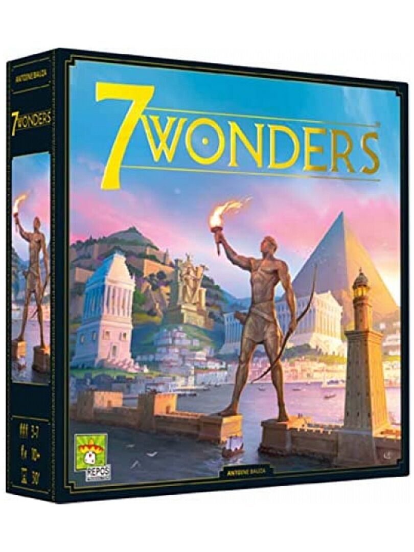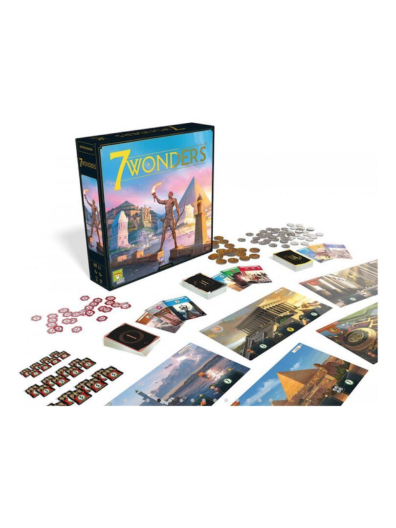 Pour ses 10 ans 7 Wonders s’offre une nouvelle jeunesse ! De nombreux éléments ont été repensés : les illustrations, la rédaction des règles, l’ergonomie des cartes, la taille des Merveilles, etc. À la tête d’une grande Cité du monde antique, exploitez les ressources naturelles de vos terres, développez vos relations commerciales et armez votre suprématie militaire. Contenu 7 plateaux Merveille, 7 cartes Merveille, 49 cartes Âge I, 49 cartes Âge II, 50 cartes Âge III, 46 jetons Conflit, 24 pièces de monnaie de valeur 3, 46 pièces de monnaie de valeur 1, 1 carnet de scores, 1 livret de règles, 1 aide de jeu, 2 cartes « 2 joueurs ». De 3 à 7 joueurs Temps de partie : 30 min A partir de 10 ans Attention ! Ne convient pas aux enfants de moins de 36 mois (3 ans)