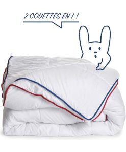 – Pour toutes saisons : 2 couettes à attacher ensemble pour une chaleur réglable- Fabrication française- Traitement Anti-acariens SANITIZED- Lavable en machine à 40°
