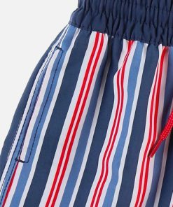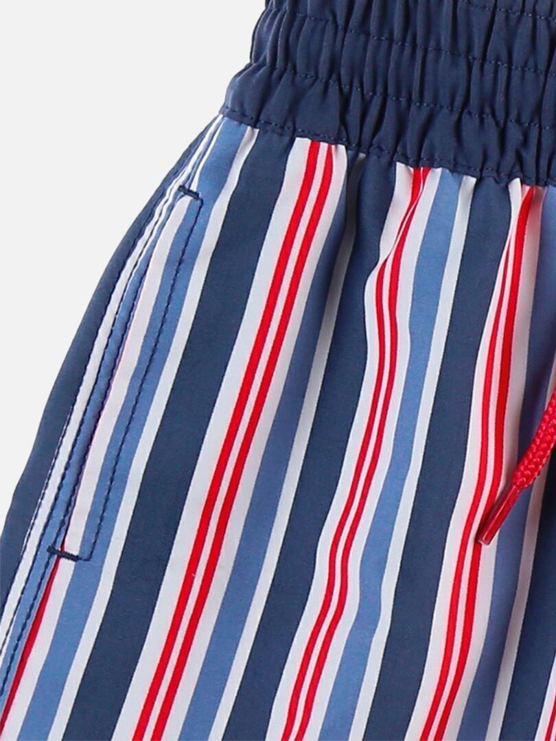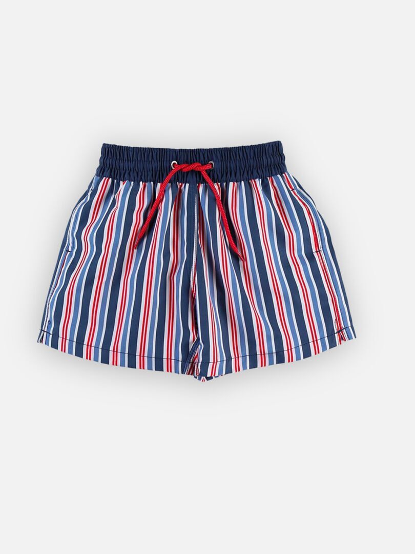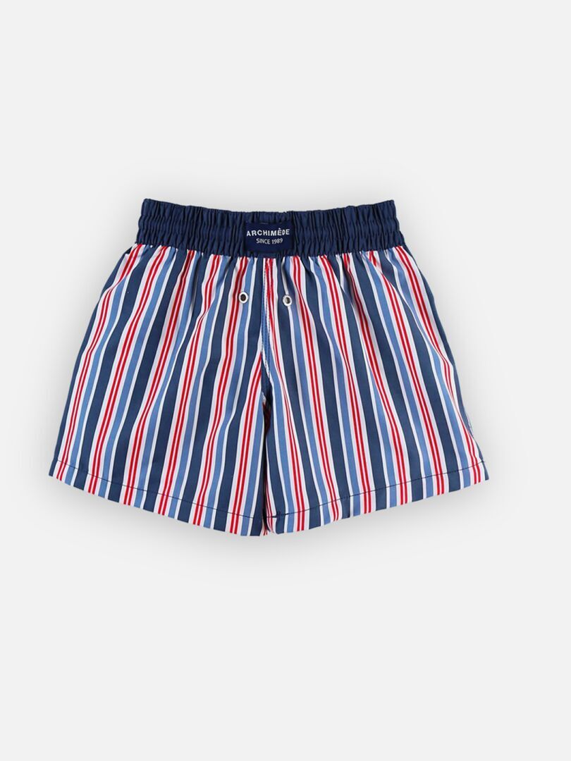 Ce short de bain rayé est doublé et sèche très rapidement. Un petit rivet permet à l’air de l’échapper pour éviter l’effet ballon une fois dans l’eau. La corde à la taille est conforme aux normes de sécurité afin d’éviter tout accident. Composition : 80%Polyester – 20%Polyamide