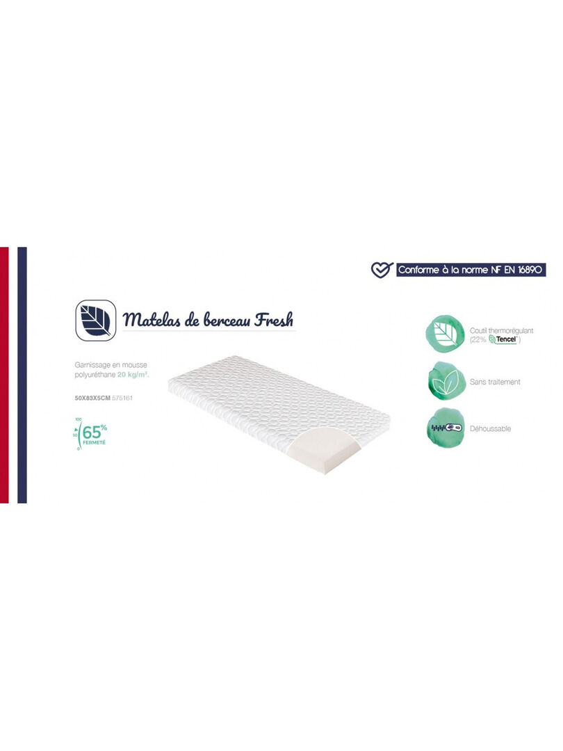 Le matelas de berceau Cododo Fresh de Candide est adapté à la plupart des berceaux du marché. Il dispose d’une dimension de 50cm x 83cm x 5cm qui assure à bébé un sommeil confortable et à une température idéale. Sa mousse polyuréthane d’excellente qualité et sa housse en Tencel font de ce matelas Fresh un parfait compagnon de nuit pour bébé.