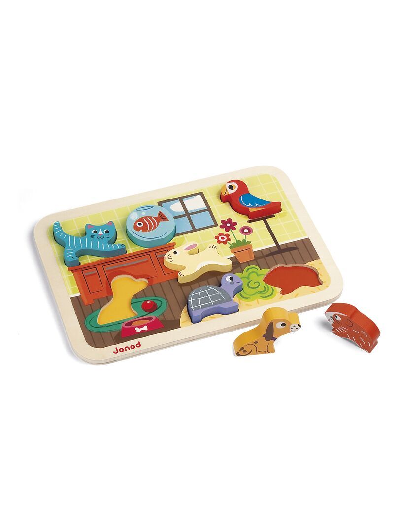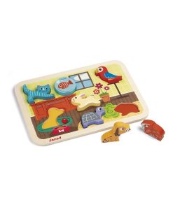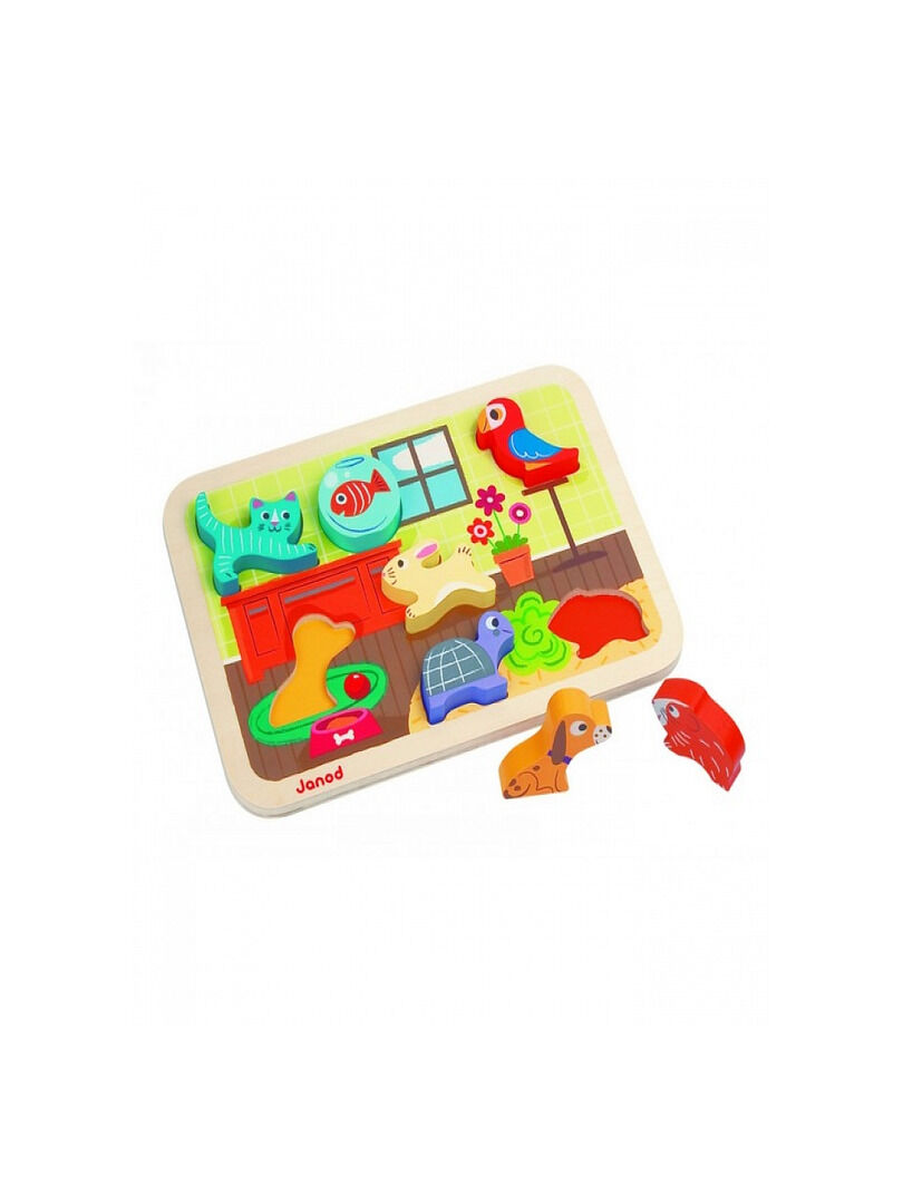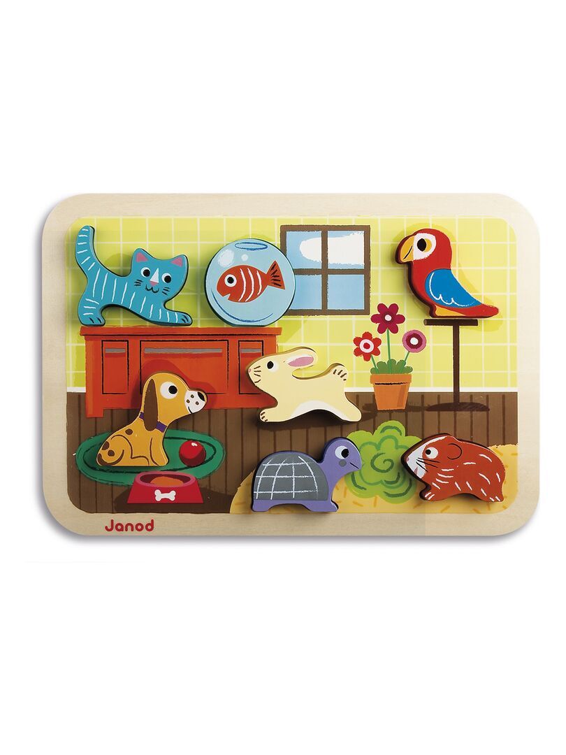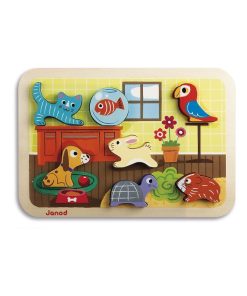 Les petits animaux familiers qui peuplent nos maisons, le chat, le poisson rouge, le perroquet, le chien, la tortue, le hamster et le petit lapin t’invitent à découvrir leur habitat grâce à ce ravissant Chunky Puzzle Animo en bois de Janod. Sauras-tu les reconnaître et les placer correctement pour reconstituer ce Puzzle ? A partir de 12 mois