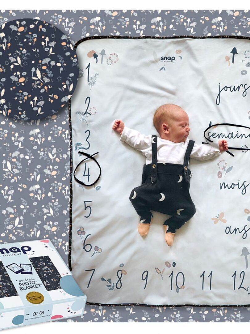 La boîte contient une couverture 2 en 1 Photobooth 100% coton, 2 cordons en coton pour entourer l’âge de bébé et une carte Snap The Moment en carton.