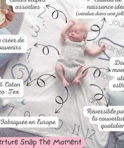 La boîte contient une couverture 2 en 1 Photobooth 100% coton, 2 cordons en coton pour entourer l’âge de bébé et une carte Snap The Moment en carton.