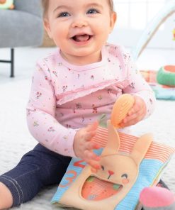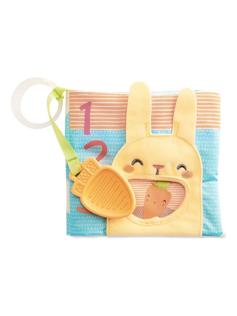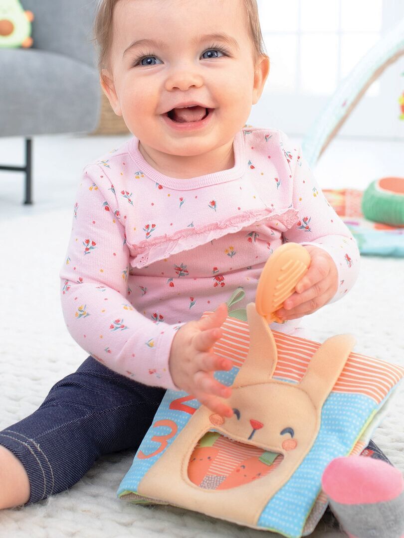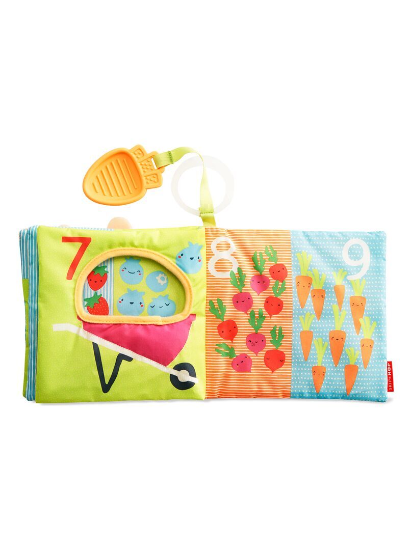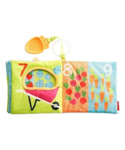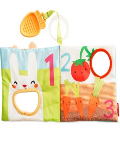 Le livre bébé en tissu Farmstand Lapin de la marque Skip Hop regorge d’activités attrayantes pour votre bébé. Avec ses grandes pages toutes douces, ce livre proposera à votre enfant des chiffres colorés, des légumes et des animaux de la ferme à découvrir, mais également un miroir, du papier bruissant et un anneau de dentition. L’anneau de fixation vous permettra de l’accrocher aux barreaux du parc, au cosy ou encore à la poussette.
