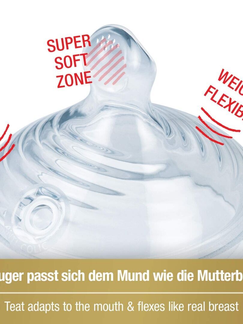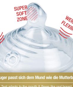 De nombreux micro-perc?ages reproduisent les micro-canaux lactife? res du sein, et assurent ainsi un de?bit de te?te?e re?gulier et naturel. La zone extra douce rend l’embout aussi souple que le sein maternel. La base e?largie et souple de la te?tine offre une sensation de succion naturelle de? s que be?be? y pose ses le? vres. La valve anti-colique innovante permet une te?te?e ininterrompue comme au sein et empe?che d’avaler de l’air, ce qui re?duit le risque de coliques.