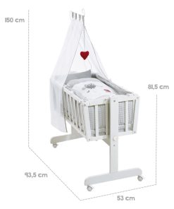 Ce berceau complet se compose d’un berceau, de linge de berceau 80×80 (coussin et couette inclus), d’un matelas à surface allongée 90×40, d’un tour de lit, d’un ciel de lit avec un support ciel de lit, et aussi des roulettes avec freins. Le berceau est équipé avec barres plates robustes et de haute qualité, ainsi que d’une fonction basculante avec un système de verrouillage. Le berceau basculante peut devenir par le verrouillage un berceau fixe. Le berceau est utilisable dès la naissance jusqu’à environ 6 mois ou jusqu’à ce que le bébé arrive à se tenir tout seul. Les textiles sont fabriqués en 100% coton testé pour les substances nocives et offrent une atmosphère optimale pour le dodo. La couette est composé d’un rembourrage en fibres respirantes et thermo-compensatrices en 100% polyester avec un tissu 100% microfibre. La couette peut être utilisée toute l’année, est très résistante et facile à laver, car elle ne se déplace pas dans la housse pendant le lavage grâce aus matelassage. Le linge de lit est composé aussi de coussin de 40x35cm et de couette 80x80cm. La couette est composée d’un rembourrage en fibres respirantes et thermo-compensatrices en 100% polyester avec un tissu 100% microfibre. Tous les matériaux utilisés sont certifiés et contrôlés régulièrement pendant la production. Tous les produits roba sont créés sur la base de ses 90 années d’expérience, développés selon les normes de sécurité européennes, pensés avec intelligence et faits pour les familles.