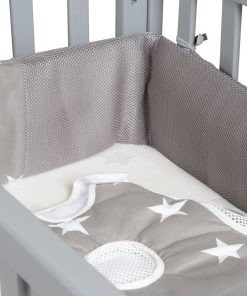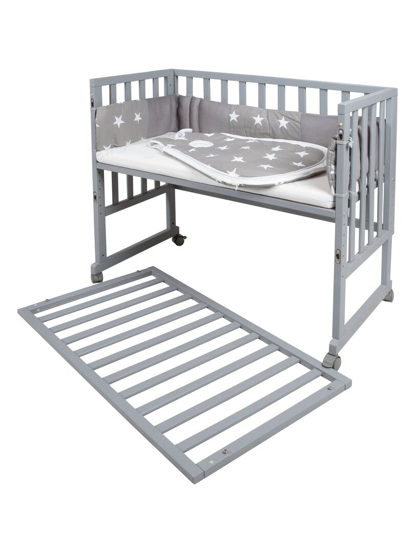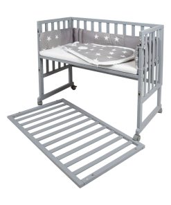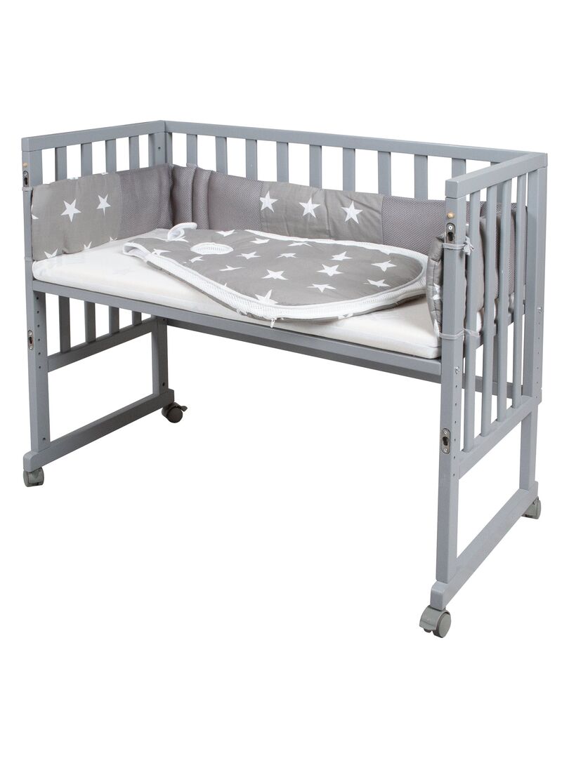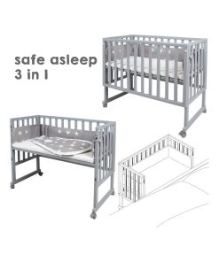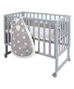 Le berceau cododo roba « safe asleep® » 3 en 1 avec des textiles au design « Little Stars » fournit un climat de sommeil idéal et est un lit cododo, un lit de bébé et un banc pour enfants en un. Le lit 3 en 1 « safe asleep® » avec roulettes à frein peut être fixé au lit parental à l’aide d’un crochet métallique et la base peut être réglée pour s’adapter à la hauteur du lit des parents. La gigoteuse « safe asleep® » (taille 56/62) et le matelas (respirant, avec housse Jacquard) sont équipés de notre système air-balance, qui fonctionne comme un climatiseur naturel. L’intérieur du matelas « safe asleep® » est testé contre les substances nocives selon la norme OEKO-TEX® 100. Le berceau cododo a été développé selon les dernières normes de sécurité conformément à la norme EN 1130-1+2:1996. Les textiles empêchent la réinspiration du CO2 et permettent une aération optimale.