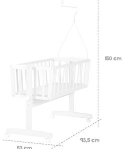Ce berceau complet se compose d’un berceau, du linge de berceau 80×80 (coussin et couette inclus), d’un matelas a surface allongée 90×40, d’un tour de lit, d’un ciel de lit avec support ciel de lit, et aussi des roulettes avec freins. Le berceau est équipé avec barres plates robustes et de haute qualité, ainsi que d’une fonction basculante avec système de verrouillage. Le berceau basculante peut devenir un berceau fixe ou un lit bébé. Le berceau est utilisable dès la naissance jusqu’à environ 6 mois ou jusqu’à ce que le bébé arrive à se tenir. Les textiles sont fabriqués en 100% coton testé pour les substances nocives et offrent une atmosphère optimale pour le dodo. La couette est composée d’un rembourrage en fibres respirantes et thermo-compensatrices en 100% polyester avec un tissu 100% microfibre. La couette peut être utilisée toute l’année, est très résistante et facile à laver car elle ne se déplace pas dans la housse pendant le lavage grâce aus matelassage. Le linge de berceau est composé de coussin de 40x35cm et une couette 80x80cm. La couette est composée d’un rembourrage en fibres respirantes et thermo-compensatrices en 100% polyester avec un tissu 100% microfibre. Tous les matériaux utilisés sont certifiés et contrôlés régulièrement pendant la production. Tous les produits roba sont créés sur la base de ses 90 années d’expérience, développés selon les normes de sécurité européennes, pensés avec intelligence et faits pour les familles.