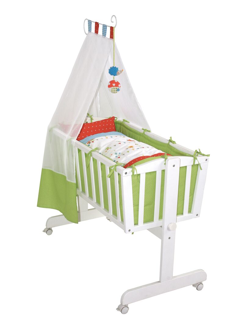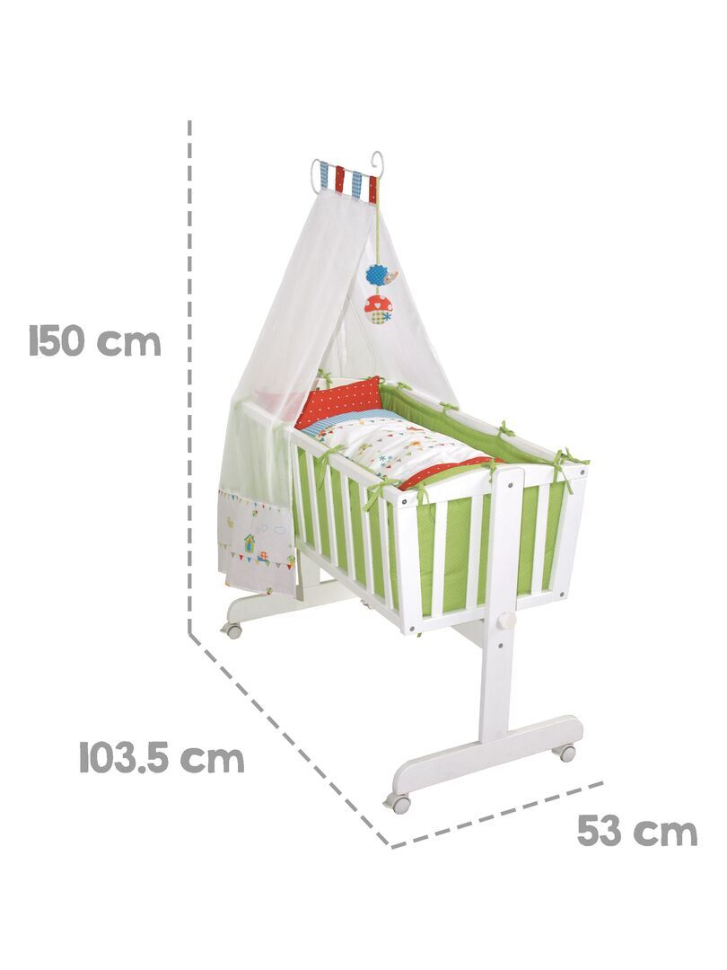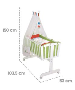 Ce berceau complet se compose d’un berceau, coussin et couette inclus, d’un matelas a surface allongée 90×40, d’un tour de lit, d’un ciel de lit avec un support ciel de lit, et aussi des roulettes avec freins. Le berceau est équipé avec barres plates robustes et de haute qualité, ainsi que d’une fonction basculante avec système de verrouillage. Le berceau basculante peut devenir un berceau fixe. Le berceau est utilisable dès la naissance jusqu’à environ 6 mois ou jusqu’à ce que le bébé arrive à se tenir tout seul. Les textiles conçus avec amour sont fabriqués en 100% coton testé pour les substances nocives et offrent une atmosphère optimale pour le dodo. La couette est composée d’un rembourrage en fibres respirantes et thermo-compensatrices en 100% polyester avec un tissu 100% microfibre. La couette peut être utilisée toute l’année, est très résistante et facile à laver car ellee ne se déplace pas dans la housse pendant le lavage grâce aus matelassage. La literie avec 2 pièces est composé de coussin de 40x35cm et une couverture 80x80cm. La couette des enfants est composée d’un rembourrage en fibres respirantes et thermo-compensatrices en 100% polyester avec un tissu 100% microfibre. Tous les matériaux utilisés sont certifiés et contrôlés régulièrement pendant la production. Tous les produits roba sont créés sur la base de ses 90 années d’expérience, développés selon les normes de sécurité européennes, pensés avec intelligence et faits pour les familles.