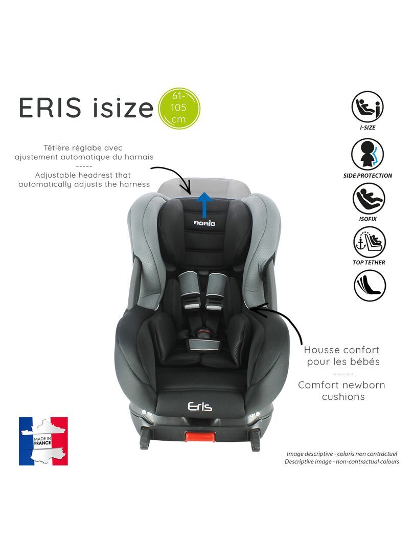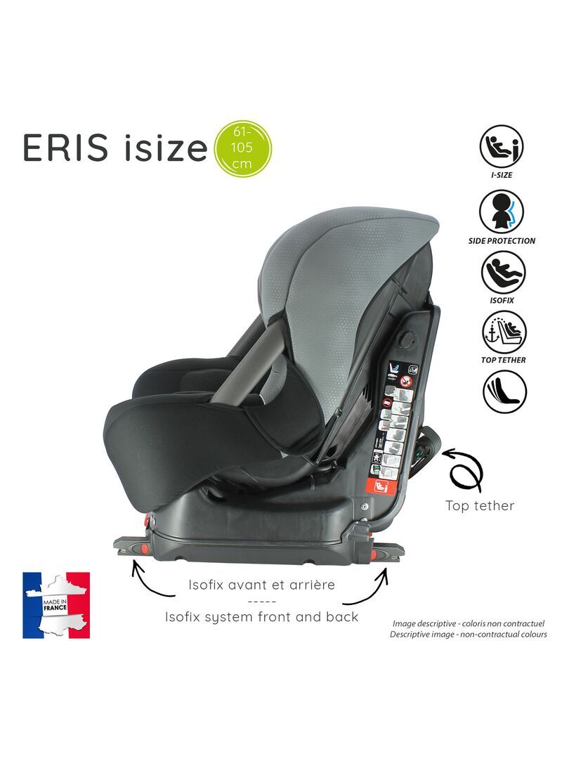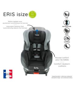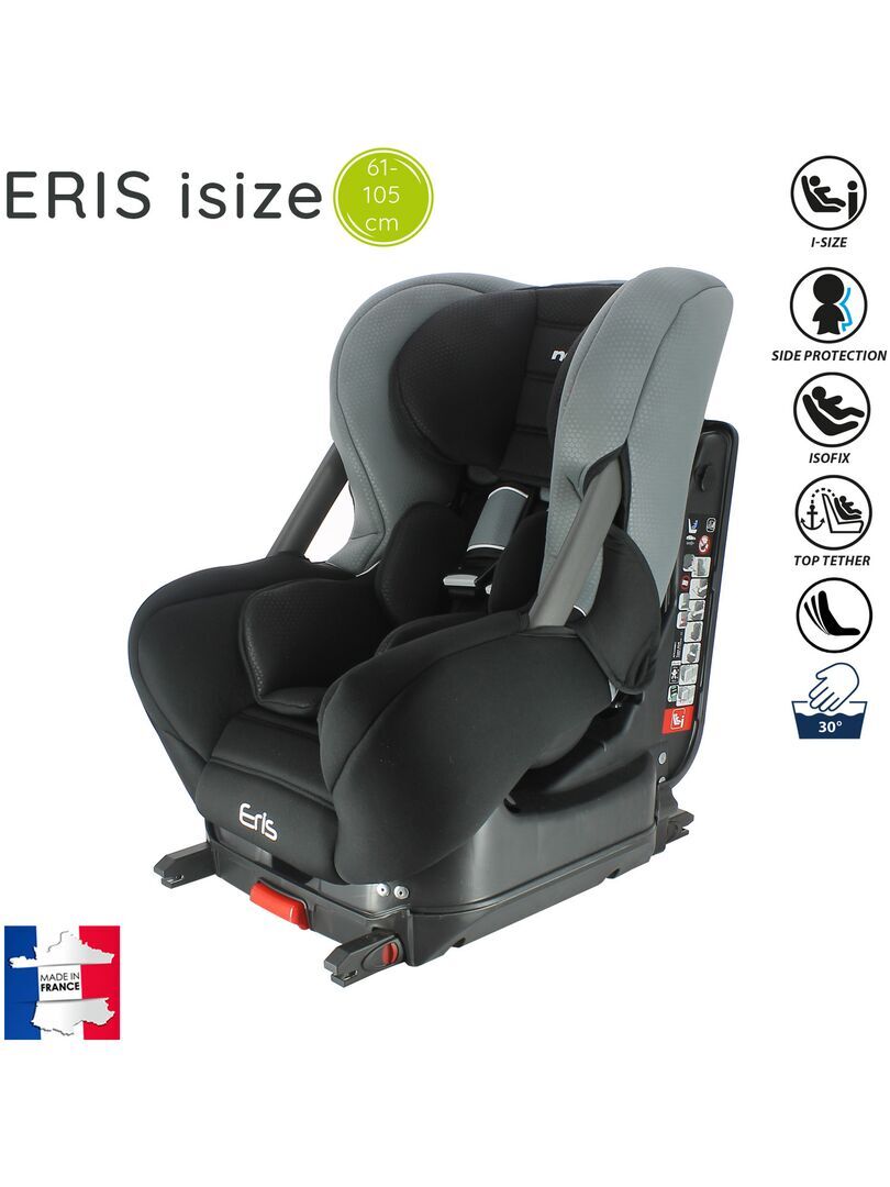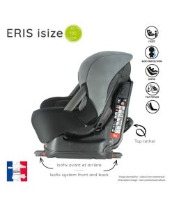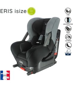 Siège auto isize ERIS pour les enfants de 61 à 105 cm offrant une grande protection à l’enfant et un confort optimal. Le siège auto isize ERIS convient aux enfants de 61 à 105 cm, il est homologué selon la norme UN R129 ISIZE et est fabriqué et testé en France. Il se positionne dos à la route de 61 à 87 cm soit à l’avant du véhicule avec le airbag désactivé, soit à l’arrière. Puis à partir de 76cm vous pouvez positionner le siège face à la route uniquement à l’arrière. Il est équipé de réducteurs nouveau-né et d’une housse bien rembourrée pour un grand confort. Il dispose d’une têtière renforcée avec protection latérale, qui se régle en hauteur avec ajustement automatique du harnais. C’est un harnais 5 points avec double réglage à l’épaule pour un bon maintien. Le siège auto ERIS ISIZE est inclinable, il dispose également de barres latérales. Le siège est déhoussable et lavable à la main.