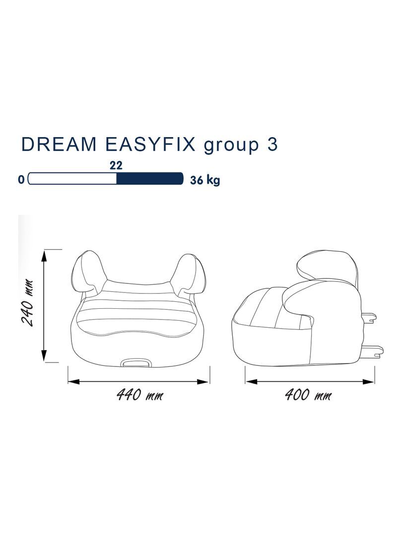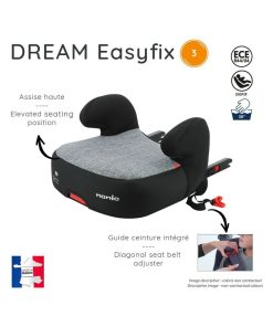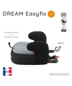 Rehausseur Easyfix enfant DREAM groupe 3 pour les enfants de 22 à 36kg, homologué selon la norme ECE R44/04, fabriqué et testé en France. Le siège enfant Easyfix DREAM est un rehausseur bas avec une housse confort et de petits accoudoirs pour une assise plus confortable. Le rehausseur enfant DREAM s’installe à l’arrière du véhicule et se fixe sur les ancrages isofix du véhicule. L’enfant est attaché avec la ceinture de sécurité 3 points du véhicule. Déhoussable et lavable à la main.
