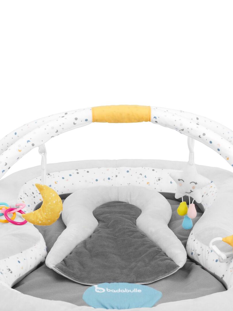 – A l’arrivée de votre bébé, vous n’avez qu’une envie : toujours l’avoir dans vos bras. Mais le rythme continue. Il vous faut parfois vos deux mains pour préparer son biberon, vous habiller, préparer un apéro en famille … – Le tapis d’éveil Badabulle est l’allié parfait pour faciliter l’éveil de votre enfant tout en vous permettant de le garder vers vous. – Votre Bout’chou est très confortablement installé dans le nid d’éveil et ce dès sa naissance grâce au réducteur nouveau-né. Amovible et repositionnable, ce réducteur maintient parfaitement votre bébé sur le dos et crée un cocon rassurant. Le tapis est très doux et douillet. Son coutour surélevé est molletonné. Votre bébé ne risque pas de rouler hors du tapis ! Pour favoriser l’éveil, 3 jouets sont inclus. Ils sont amovibles tout comme l’arche et se fixent à plusieurs endroits du tapis en fonction de l’âge et de la taille de votre enfant. Tout petit, vous placez les jouets plus proches de lui sur les rebords du tapis, en grandissant vous les déplacez sur la double arche par exemple. – Pratique, ce tapis d’éveil peut se glisser dans un parc bébé. Il se plie très simplement pour un rangement et un transport facilité. Le centre du tapis est amovible et lavable en machine (30°).