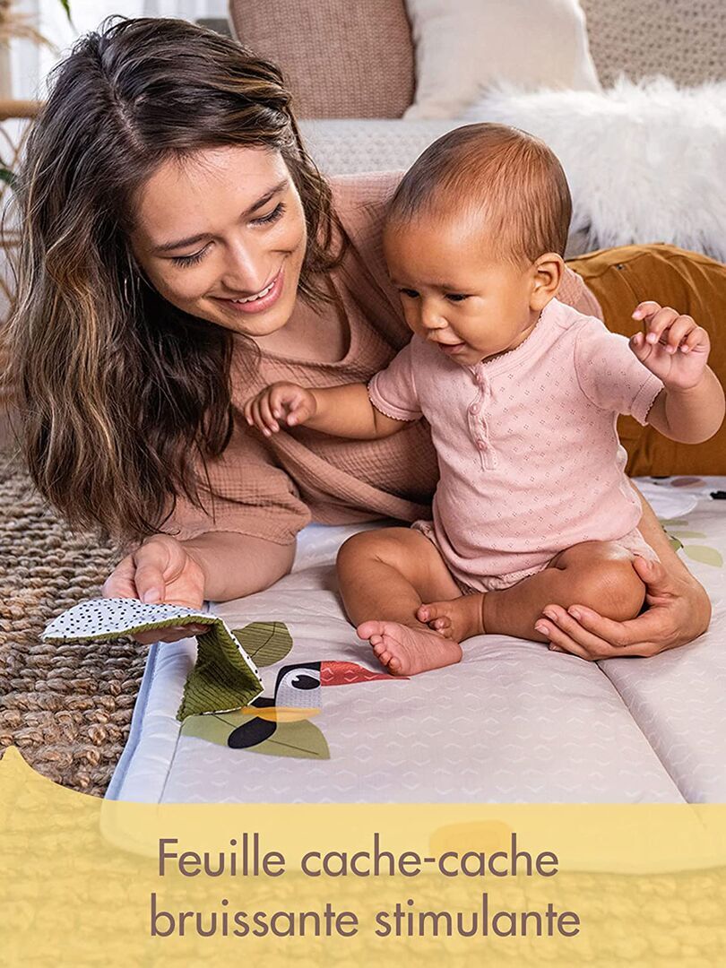 Tapis d’éveil Géant (100x150cm) dès la naissance. 6 activités d’éveil stimulantes pour la croissance de bébé. Facile à plier et à transporter. Tissus rembourré pour plus de confort.