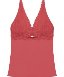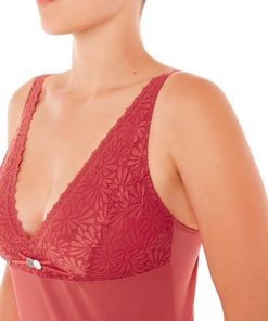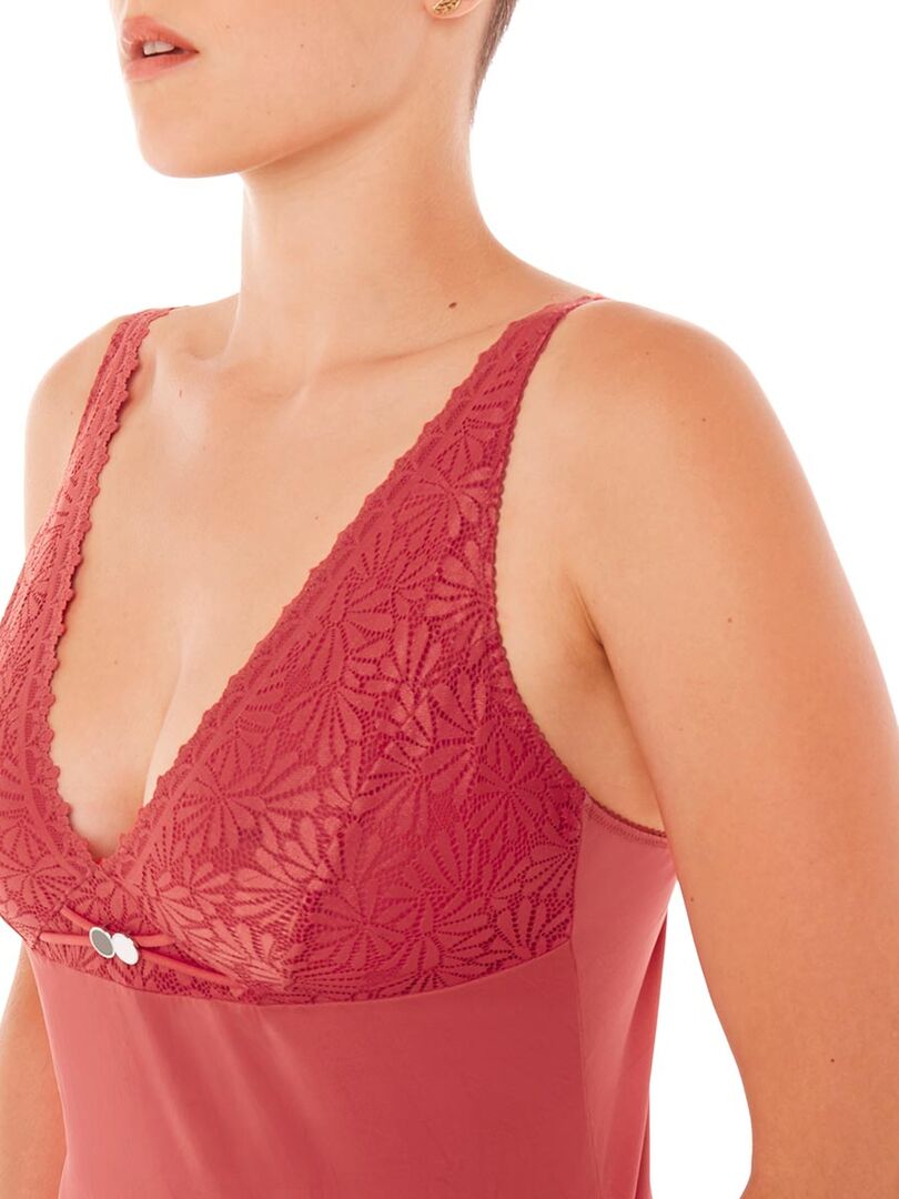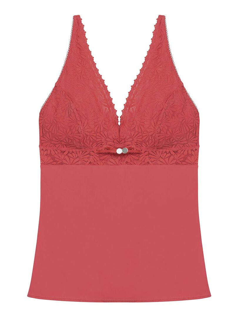 Top en dentelle florale et microfibre. Bijou émaillé à l’entre-seins. Bretelles en dentelle réglables. Disponible du 38/40 au 46/48
