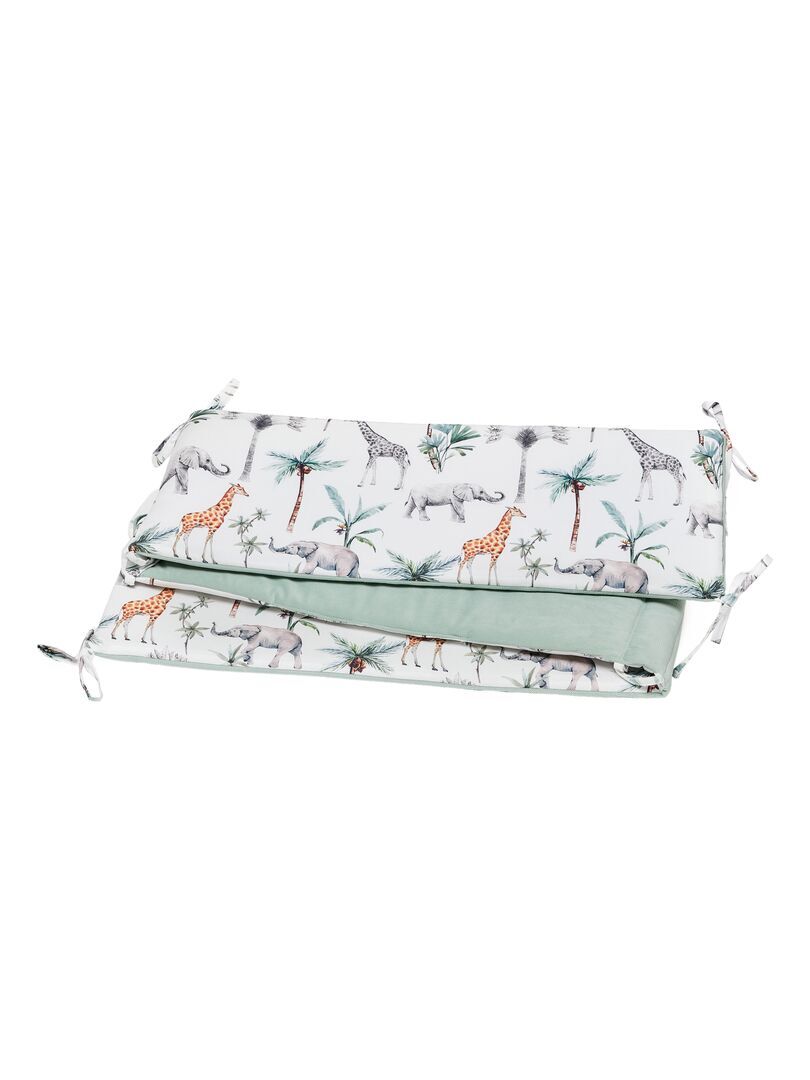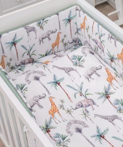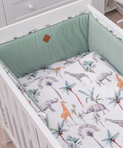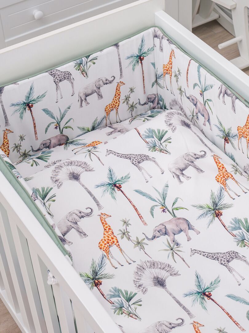 Son design délicat et coloré de la Collection Safari vous fera craquer ! Le tour de lit Safari aux jolis imprimés d’animaux et de palmiers pour de belles aventures durant les doux sommeil de Bébé. Un linge de lit moderne à l’esprit jungle, sublimé par son joli liseré vert d’eau qui vient border le tour de lit, tout en garantissant un confort optimal.
