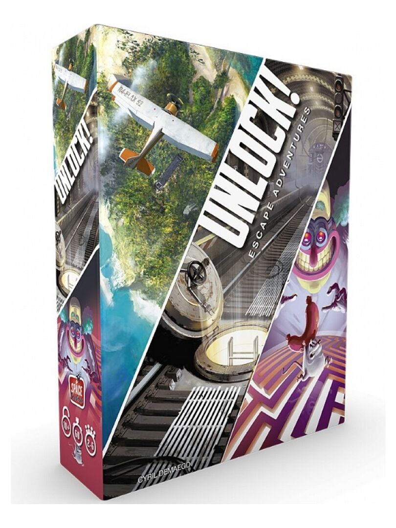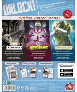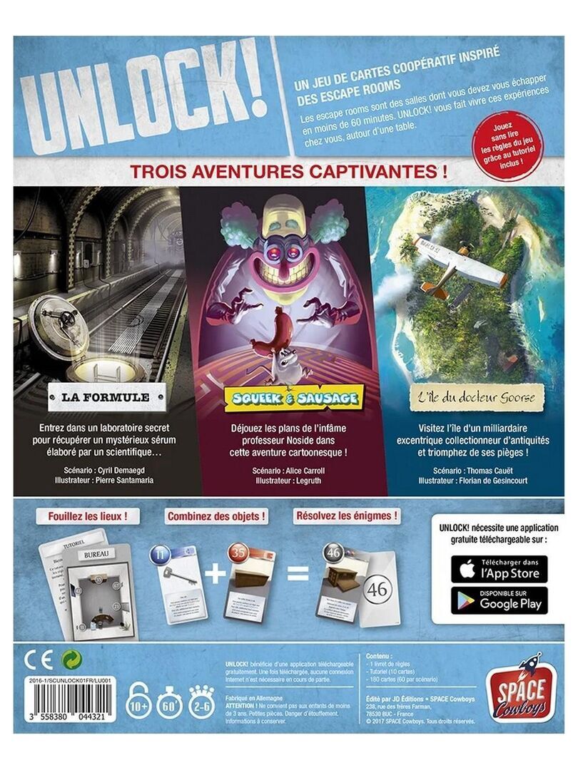 L’application gratuite Unlock!, compatible avec les téléphones et tablettes Android et iOS, est nécessaire pour jouer. Elle permet d’obtenir des indices, de repérer des objets cachés, mais aussi d’entrer les codes découverts. Elle contribue également à l’ambiance avec ses musiques dédiées à chaque aventure, ses énigmes audio, ses terribles pénalités et son compte à rebours fatal ! Afin de bien appréhender les règles, la boîte contient une dizaine de cartes servant de tutoriel. Les cartes du tutoriel sont emballées avec les cartes du scénario 1. La boîte Unlock! contient trois aventures : La Formule : Entrez dans un laboratoire secret pour récupérer un mystérieux sérum élaboré par un scientifique Squeek & Sausage : Déjouez les plans de l’infâme professeur Noside dans cette aventure cartoonesque. L’île du docteur Goorse : Visitez l’île d’un milliardaire excentrique collectionneur d’antiquités et triomphez de ses pièges. Contenu : 1 livret de règles 1 tutoriel de 10 cartes (permet d’apprendre les règles du jeu sans avoir à les lire) La Formule (60 cartes) Squeek & Sausage (60 cartes) L’île du docteur Goorse (60 cartes) Langue: Français / French version Age: à partir de 10 ans Durée de jeu: 1 à 2h Nombre de joueurs: 2 à 6 joueur(s) A partir de 10 ans Attention ! Ne convient pas aux enfants de moins de 36 mois (3 ans)