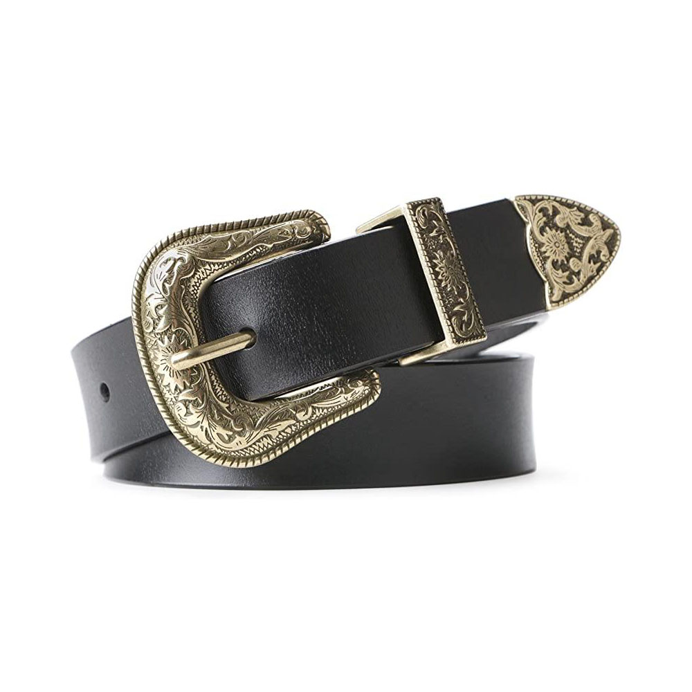 Women Leather Belts Ladies Vintage Western Design Black Waist Belt for Pants Jeans Dresses